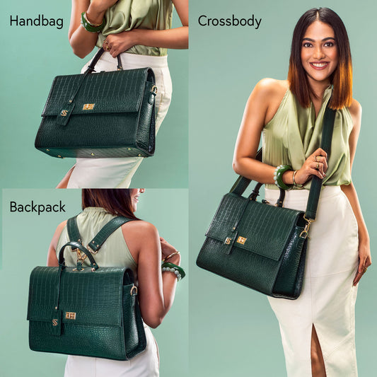 The Compact Convertible Work Bag for 14" laptops: Emerald Elegance (3 in 1 - Backpack, Crossbody/Tote & Handbag)
