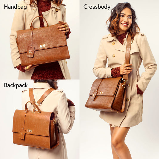 The Compact Convertible Work Bag for 14" laptops: Mocha Elegance (3 in 1 - Backpack, Crossbody/Tote & Handbag)