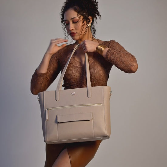 An everyday tote, elevated. With space for a 16” laptop, luggage sleeve, multiple inner and outer pockets for effortless organisation, and a detachable strap for versatility, this piece is designed to move with you. The sleek boat silhouette and elegant finish make it a timeless companion for work, travel, and everything in between.