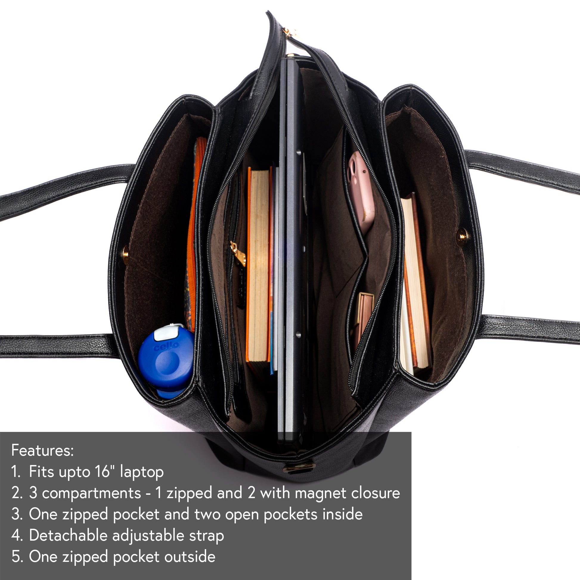 - Compartments and pockets inside the bag: Three main compartments (one zipped compartment and two compartments with magnetic closures). Zipped compartment has two open pockets and one zipped pocket inside.