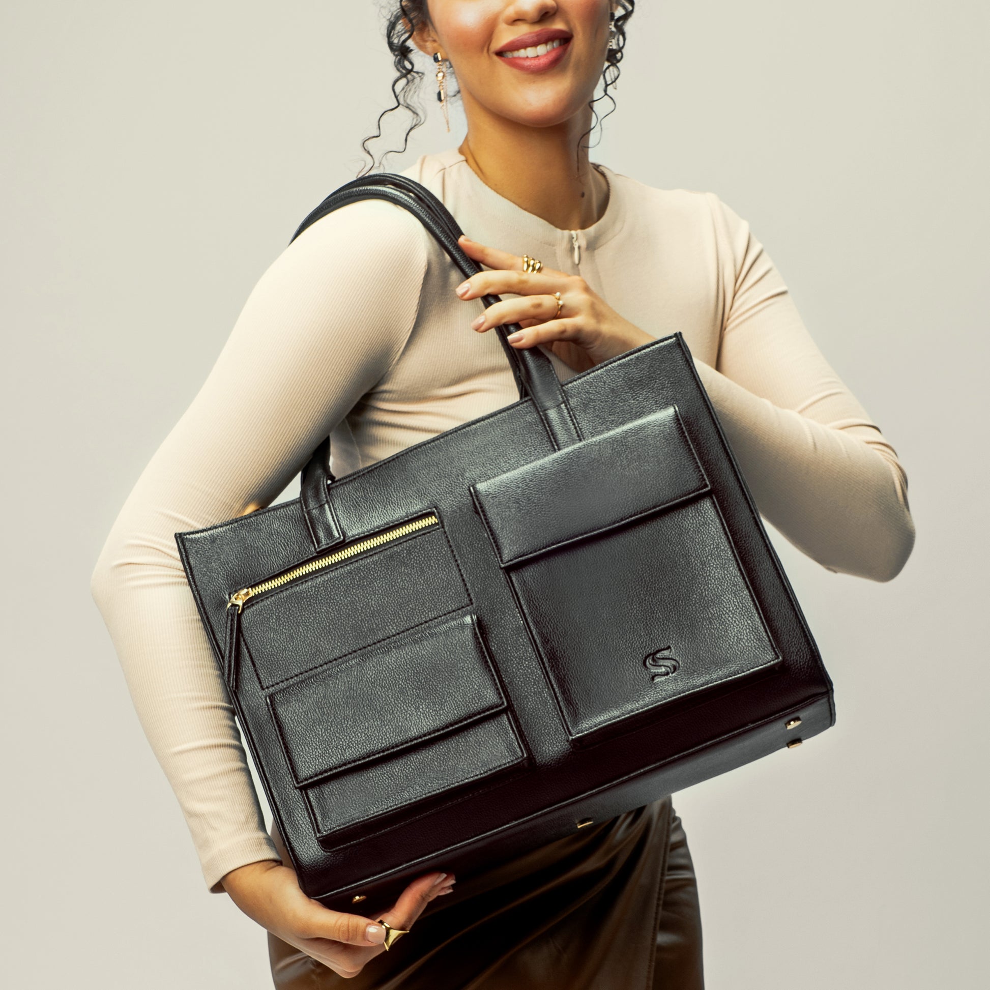 Chic on the outside. Intelligent on the inside. With space for a 16” laptop, a detachable adjustable strap, luggage sleeve, bottle holder, and thoughtfully placed pockets, this tote is designed for seamless everyday carry. Finished in a sleek, refined silhouette, it is the perfect balance of elegance and practicality.