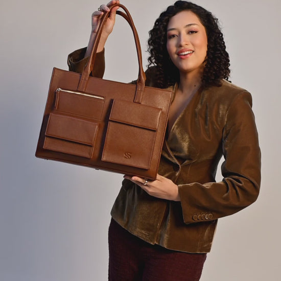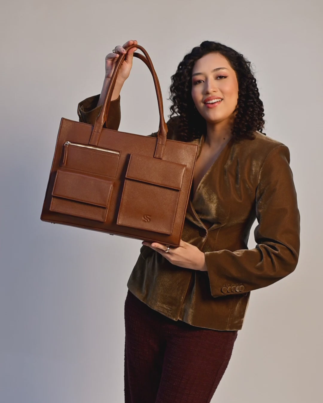 Chic on the outside. Intelligent on the inside. With space for a 16” laptop, a detachable adjustable strap, luggage sleeve, bottle holder, and thoughtfully placed pockets, this tote is designed for seamless everyday carry. Finished in a sleek, refined silhouette, it is the perfect balance of elegance and practicality.