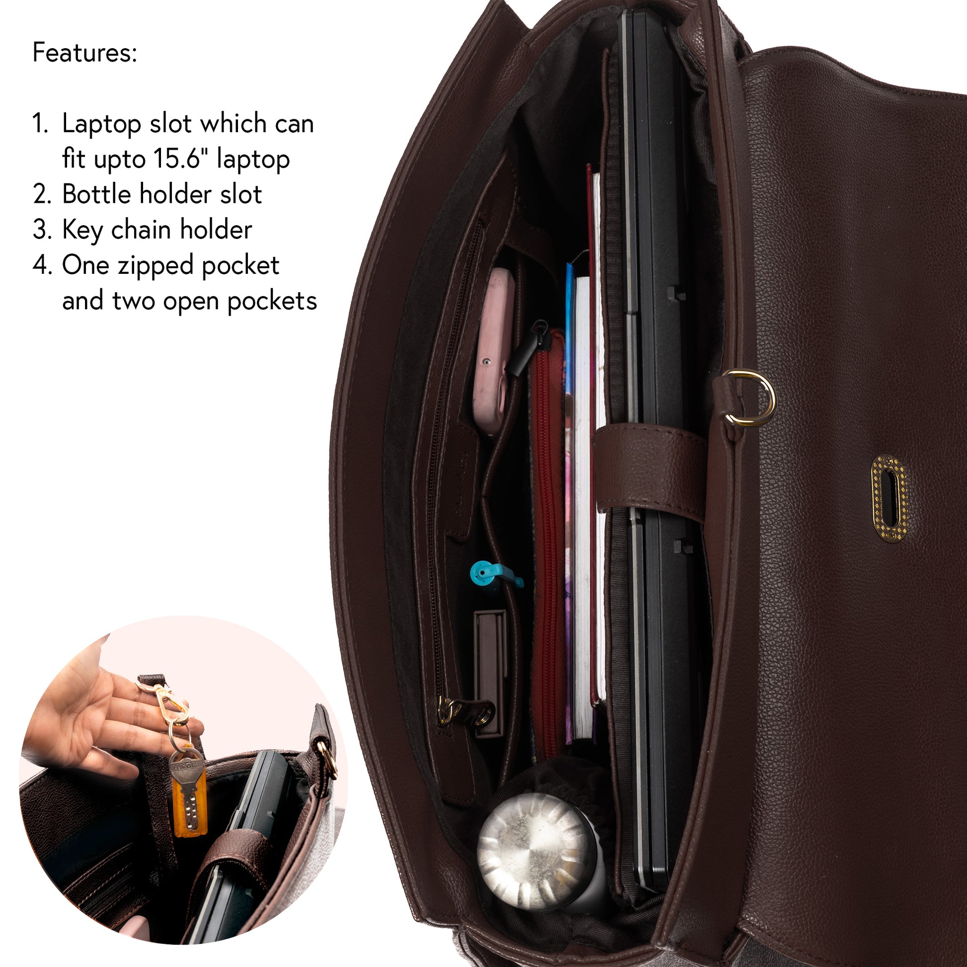 - Compartments and pockets inside the bag: One main compartment with laptop slot. One zipped pocket and two open pockets inside. One zipped pocket outside (hidden pocket)
